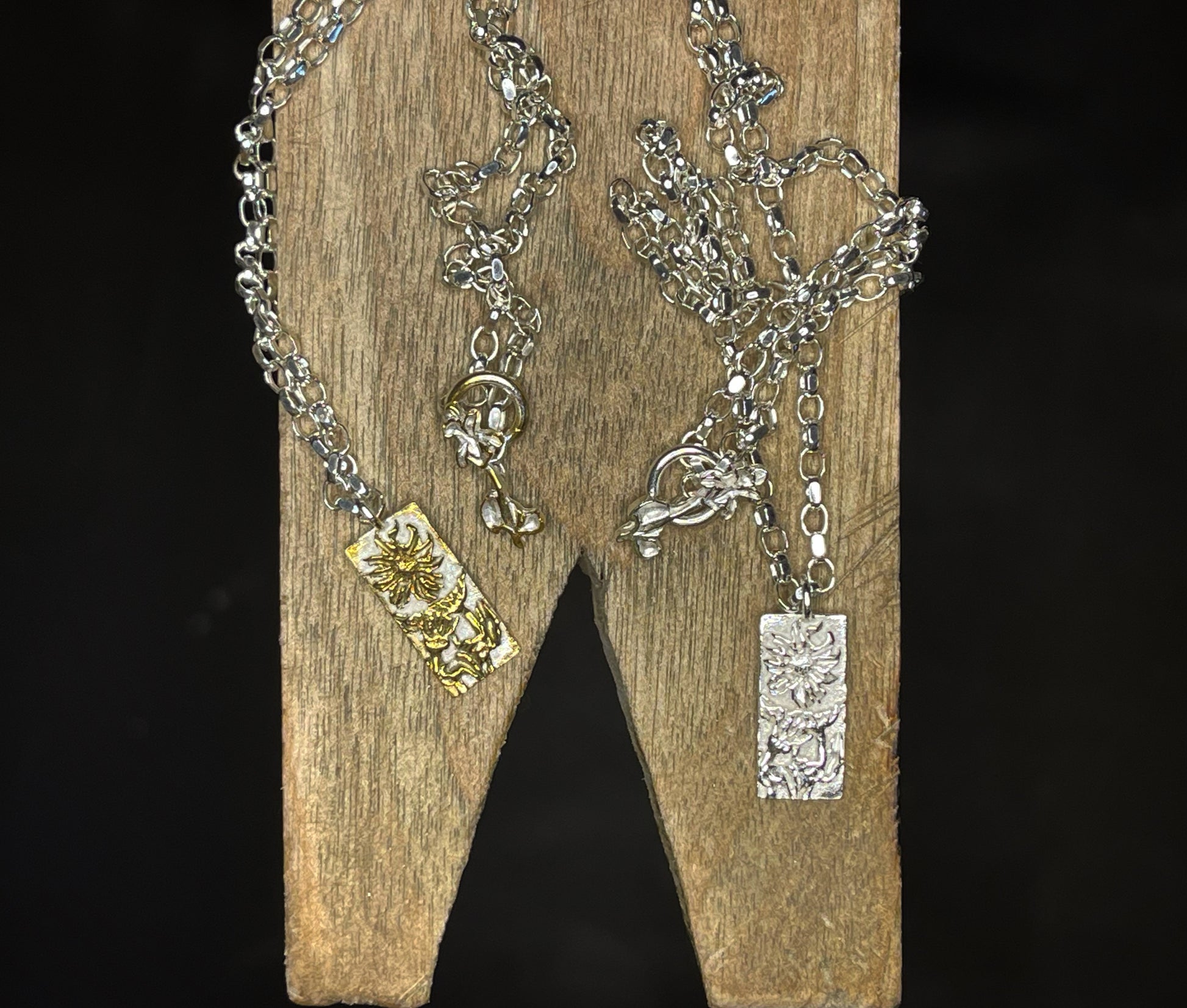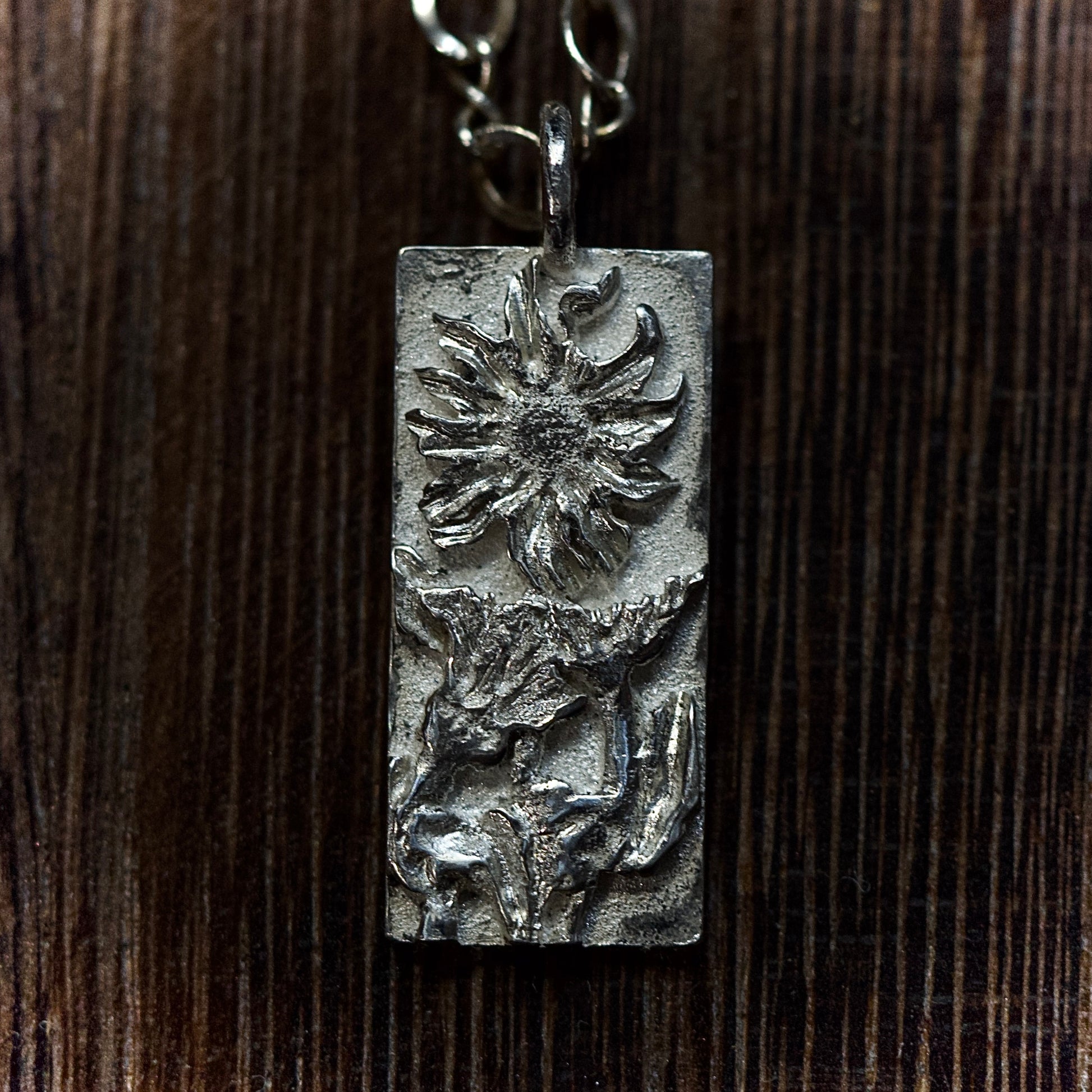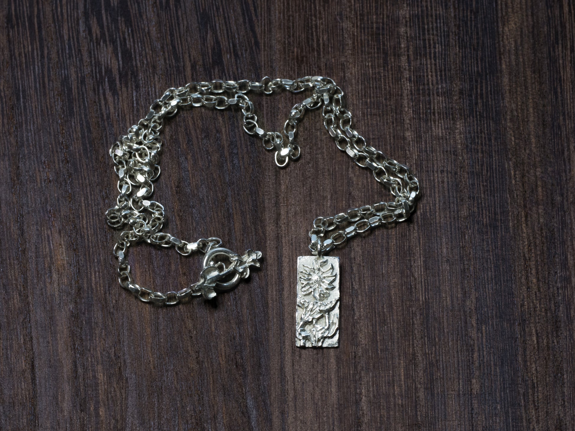 The pendant, chain, and clasp are all made entirely in Argentium silver. Argentium silver is an alloy similar to sterling but with a higher amount of fine silver. It’s brighter white in color, hypoallergenic, tarnish resistant, and eco friendly as the maker of Argentium silver always utilizes all available recyclable metals before ever depleting newly mined resourses. Additionally, I find finished Argentium silver to have a uniquely silky feel that I haven’t noticed in other metals.